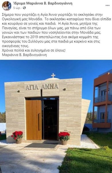 “Σήμερα, που γιορτάζει η Αγία Άννα, γιορτάζει το εκκλησάκι στην Ογκολογική μας Μονάδα” αναφέρει το Ίδρυμα Μαριάννα Β. Βαρδινογιάννη σε επίκαιρη ανάρτησή του. Πρόκειται για το εκκλησάκι της Ογκολογικής Μονάδας Παίδων “Μαριάννα Β. Βαρδινογιάννη – ΕΛΠΙΔΑ”, το καταφύγιο που δίνει ελπίδα και κουράγιο σε γονείς και παιδιά. “H Αγία Άννα, μητέρα της Παναγίας, είναι το στήριγμα όλων μας, μα πάνω από όλα των γονιών και των παιδιών που νοσηλεύονται στην Μονάδα μας. Εγκαινιάστηκε το 2019 αποτελώντας ένα ακόμα κομμάτι της προσφοράς του Συλλόγου μας στα παιδιά με καρκίνο και στις οικογένειες τους. Χρόνια πολλά και ευλογημένα σε όλους!”.