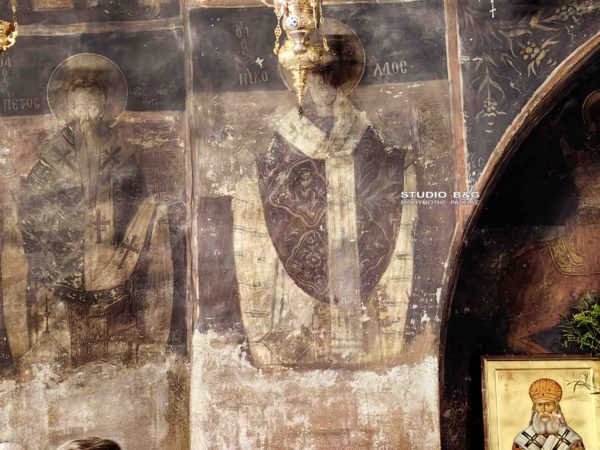 Ο ναός διαθέτει τοιχογραφίες οι οποίες ανάγονται στον 17ο και τον 18ο αιώνα, αλλά, δυστυχώς, στο πέρασμα του χρόνου έχουν προκληθεί φθορές. Στο υπέρθυρο της εισόδου, η τοιχογραφία είναι σε καλή κατάσταση και αναπαριστά σκηνές από την Αποκάλυψη του Ιωάννη.