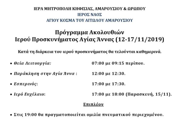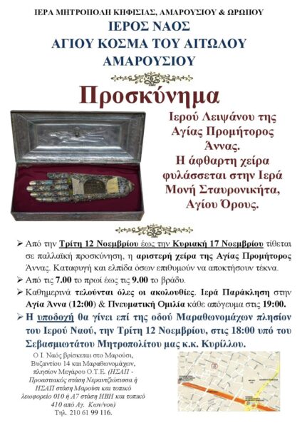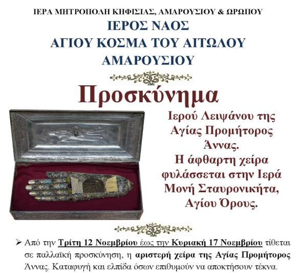 Έως την Κυριακή 17 Νοεμβρίου 2019, στον Ιερό Ναό Αγίου Κοσμά Αιτωλού Αμαρουσίου τίθεται σε προσκύνηση η αριστερή χείρα της Αγίας Προμήτορος Άννας, καταφυγή και ελπίδα ιδιαιτέρως των όσων επιθυμούν να αποκτήσουν τέκνα. Η άφθαρτη χείρα της Αγίας φυλλάσεται στην Ιερά Μονή Σταυρονικήτα Αγίου Όρους.