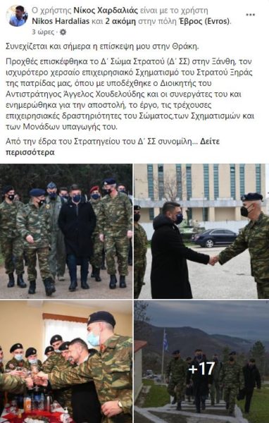 18/12/2021 18/12/2021 Ο Υφυπουργός Εθνικής Άμυνας κ. Νικόλαος Χαρδαλιάς, συναντήθηκε με τον Μητροπολίτη Μαρωνείας και Κομοτηνής κ. Παντελεήμωνα, τον Μητροπολίτη Αλεξανδρουπόλεως κ. Άνθιμο, και με τον Μητροπολίτη Ξάνθης και Περιθωρίου κ. Παντελεήμωνα, την Παρασκευή 17 Δεκεμβρίου 2021, κατά τη διάρκεια της δεύτερης μέρας παραμονής του στην Θράκη. Ταυτόχρονα, ο Υφυπουργός Εθνικής Αμύνης επισκέφθηκε Σχηματισμούς, Μονάδες και Επιτηρητικά...