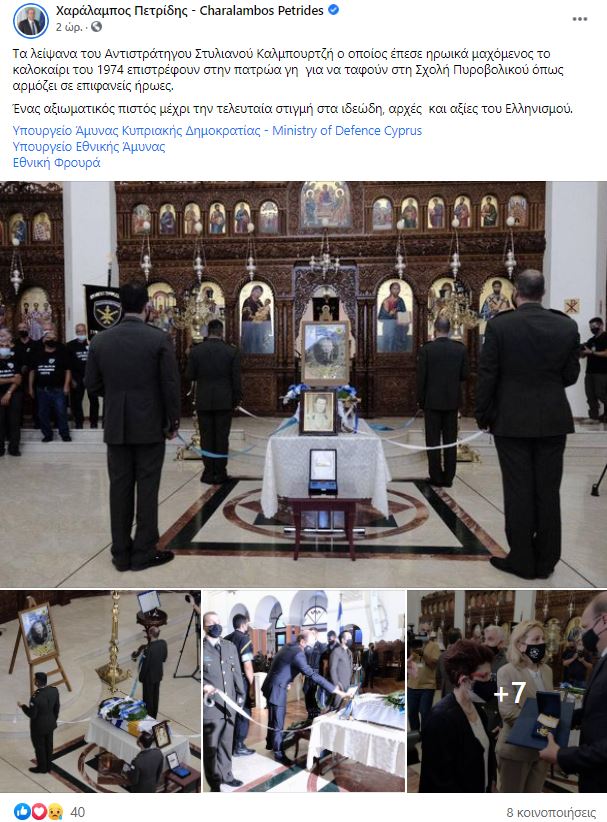 Από την πλευρά του ο Υπουργός Άμυνας Χαραλάμπος Πετρίδης με ανάρτηση του σε μέσο κοινωνικής δικτύωσης, απέτισε φόρο τιμής στον ηρωικώς πεσόντα κατά την τουρκική εισβολή του 1974 Αντιστράτηγο Στυλιανό Καλμπουρτζή: