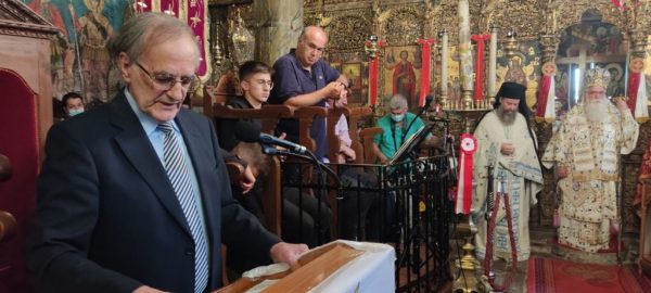 Ακολούθως, ο Σεβασμιώτατος αναφέθηκε στην προσφορά των Νεομαρτύρων στον Αγώνα για την Ελευθερία, με αφορμή την μνήμη των Νεομαρτύρων της Τριπόλεως Δημητρίου και Παύλου, που γιορτάζεται σήμερα: “είναι αυτοί που δεν αρνήθηκαν την πίστη στον Χριστό και ως τίμημα πλήρωσαν την ίδια τη ζωή τους. Οι Νεομάρτυρες κράτησαν άσβεστη την ελπίδα και την πίστη ότι θα έρθει η ώρα της αναστάσεως της πατρίδας. Είθε να φανουμε κι εμείς αντάξιοί τους, για να ελπίζουμε σε ένα καλύτερο μέλλον για την πατρίδα και το Έθνος μας”.