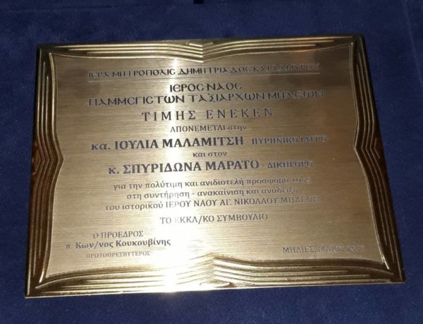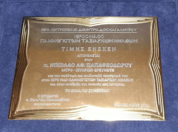 Στο τέλος της εκδήλωσης ο Σεβασμιώτατος απένειμε τιμητικές πλακέτες, εκ μέρους του Ναού στο ζεύγος Σπυρίδωνα Μαράτο, Δικηγόρο και Ιουλία Μαλαμίτση, Πυρηνική Ιατρό, για την συνεισφορά τους στην ανακαίνιση του Καθολικού της παλαιάς Ιεράς Μονής Αγίου Νικολάου Μηλεών, και στον Ιατρό κ. Νικόλαο Παπαθεοδώρου, για την συγγραφή του βιβλίου με την ιστορία του Ναού των Ταξιαρχών.