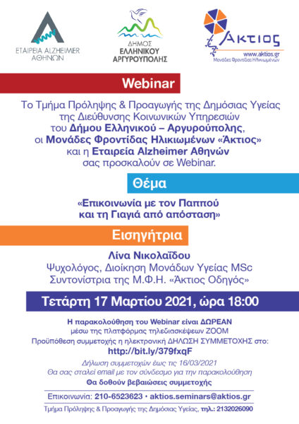 Το Τμήμα Πρόληψης και Προαγωγής της Δημόσιας Υγείας της Διεύθυνσης Κοινωνικών Υπηρεσιών του Δήμου Ελληνικού – Αργυρούπολης, οι Μονάδες Φροντίδας Ηλικιωμένων «Άκτιος» και η Εταιρεία Alzheimer Αθηνών σας προσκαλούν σε Webinar.