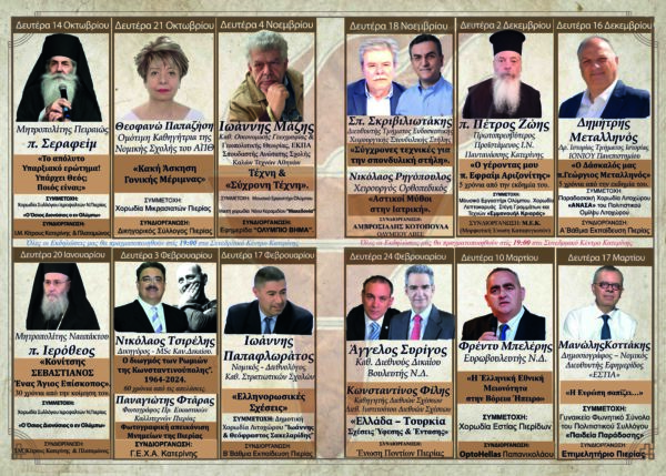 Η Πρεμιέρα των εκδηλώσεων του Ανοικτού Πανεπιστημίου Κατερίνης θα γίνει την Δευτέρα 14-10-2024 στις 19:00 με επίσημο ομιλητή και καλεσμένο τον Μητροπολίτη Πειραιώς π. Σεραφείμ και θέμα: «Το απόλυτο υπαρξιακόν ερώτημα: Υπάρχει Θεός; Ποιος είναι;»