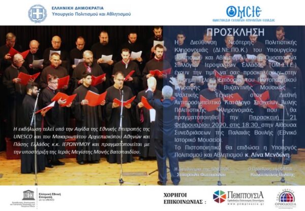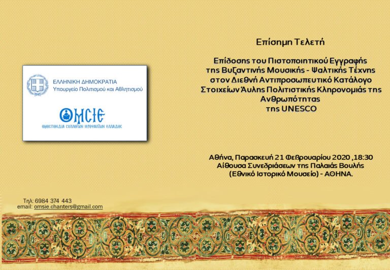 Tην «ιστορική» εγγραφή της Βυζαντινής Μουσικής – Ψαλτικής Τέχνης στον Διεθνή Αντιπροσωπευτικό Κατάλογο Στοιχείων Άυλης Πολιτιστικής Κληρονομιάς της Ανθρωπότητας της UNESCO, επισφραγίζουν, γιορτάζουν και δημοσιοποιούν, με ένα διήμερο Εκδηλώσεων, την Παρασκευή 21 και το Σάββατο 22 Φεβρουαρίου 2020, η ΔΙΕΥΘΥΝΣΗ ΝΕΟΤΕΡΗΣ ΠΟΛΙΤΙΣΤΙΚΗΣ ΚΛΗΡΟΝΟΜΙΑΣ (ΔΙ.ΝΕ.ΠΟΚ) του Υπουργείου Πολιτισμού και Αθλητισμού και η ΟΜΟΣΠΟΝΔΙΑ ΣΥΛΛΟΓΩΝ ΙΕΡΟΨΑΛΤΩΝ ΕΛΛΑΔΟΣ (ΟΜ.Σ.Ι.Ε.).