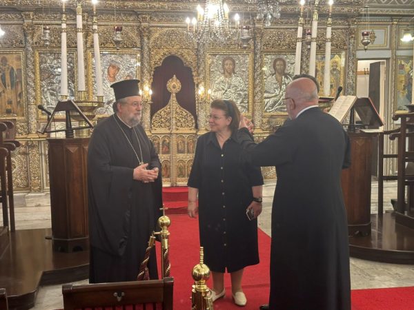 Ακολούθως, την Υπουργό υποδέχθηκε στην Ιερά Μητρόπολη Πριγκηποννήσων ο Σεβασμιώτατος Μητροπολίτης Γέρων Πριγκηποννήσων κ. Δημήτριος, ο οποίος την ξενάγησε στον Ιερό Ναό της Παναγίας Ελεούσης.