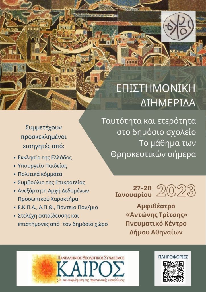 Ο Πανελλήνιος Θεολογικός Σύνδεσμος «ΚΑΙΡΟΣ» ανοίγει ξανά τη συζήτηση για το μάθημα των Θρησκευτικών σε Επιστημονική Διημερίδα, η οποία θα πραγματοποιηθεί στις 27 και 28 Ιανουαρίου 2023, στο Αμφιθέατρο «Αντώνης Τρίτσης» του Πνευματικού Κέντρου του Δήμου Αθηναίων, με θέμα «Ταυτότητα και ετερότητα στο δημόσιο σχολείο. Το μάθημα των Θρησκευτικών σήμερα».