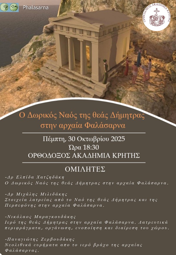 Η Ορθόδοξος Ακαδημία Κρήτης και ο Σύλλογος Φίλων αρχαίας Φαλάσαρνας «Νίκος Κακαουνάκης» σε συνεργασία με την Εφορεία Αρχαιοτήτων Χανίων, προσκαλούν στην Επιστημονική Ημερίδα, με θέμα: «Ο Δωρικός Ναός της Θεάς Δήμητρας στην αρχαία Φαλάσαρνα», η οποία θα πραγματοποιηθεί την Πέμπτη 30 Οκτωβρίου και ώρα 18:30, στην Ορθόδοξο Ακαδημία Κρήτης.