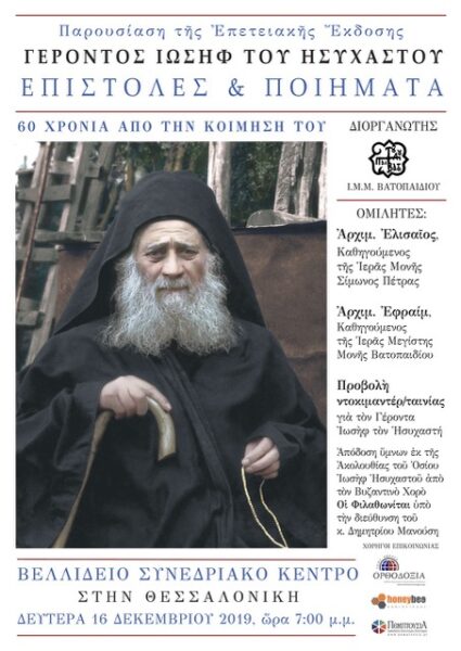 Με την ευκαιρία της επετειακής εκδόσεως της Ιεράς Μεγίστης Μονής Βατοπαιδίου, Γέροντος Ιωσήφ του Ησυχαστού, «Επιστολές και Ποιήματα (60 χρόνια από την κοίμηση του)», η Μονή Βατοπαιδίου διοργανώνει για την παρουσίαση της νέας αυτής εκδόσεως εκδήλωση, η οποία θα πραγματοποιηθεί την Δευτέρα 16 Δεκεμβρίου 2019 και ώρα 7:00 μ.μ. στην Θεσσαλονίκη στο Βελλίδειο Συνεδριακό Κέντρο.