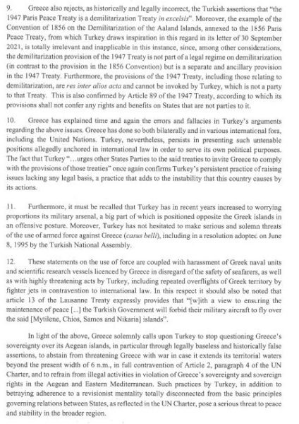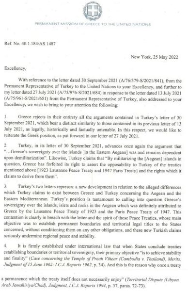 Στην επιστολή αναφέρεται μεταξύ άλλων ότι οι τουρκικοί ισχυρισμοί αποτελούν νέα εξέλιξη που υπονομεύει σοβαρά την περιφερειακή ειρήνη και τη σταθερότητα. Χαρακτηρίζονται «νομικά, ιστορικά και πραγματολογικά αστήρικτοι» οι τουρκικοί ισχυρισμοί ότι η ελληνική κυριαρχία στα νησιά του ανατολικού Αιγαίου είναι εξαρτημένη από την αποστρατιωτικοποίησή τους.