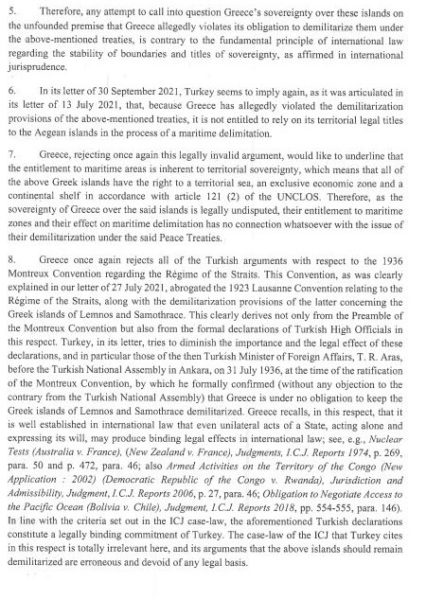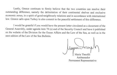 Η επιστολή καταλήγει λέγοντας ότι η Ελλάδα καλεί την Τουρκία να σταματήσει να αμφισβητεί την κυριαρχία επί των νησιών του Αιγαίου, να απέχει από την απειλή χρήσης βίας, παραβιάζοντας έτσι το άρθρο 2(4) του Χάρτη ου ΟΗΕ, και να σταματήσει να πραγματοποιεί παράνομες ενέργειες, οι οποίες παραβιάζουν την κυριαρχία και τα κυριαρχικά δικαιώματα της Ελλάδας στο Αιγαίο και στην Ανατολική Μεσόγειο.