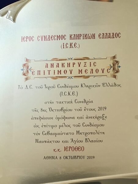 Τό Δ.Σ. τοῦ Ἱεροῦ Συνδέσμου Κληρικῶν Ἑλλάδος (ΙΣΚΕ) στήν τακτική Συνεδρία τῆς 8ης Ὀκτωβρίουτοῦ ἔτους 2019 ἀπεφάσισε ὁμόφωνα καί ἀνεκήρυξε ὡς ἐπίτιμο μέλος τοῦ Συνδέσμου τόν Σεβασμιώτατο Μητροπολίτη Ναυπάκτου καί ἉγίουΒλασίου κ.κ. ΙΕΡΟΘΕΟ».