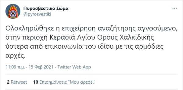 Με ανάρτησή του το Πυροσβεστικό Σώμα ενημέρωσε για επιχείρηση για τον εντοπισμό ενός αγνοουμένου στο Άγιον Όρος της Χαλκιδικής.