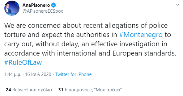 Η Εκπρόσωπος της Ευρωπαϊκής Επιτροπής Άνα Πισονέρο (Ana Pisonero) δημοσίευσε σήμερα ένα tweet στο οποίο εκφράζει την ανησυχία της για τις κατηγορίες για την αστυνομική βία στο Μαυροβούνιο και αναφέρει ότι αναμένει την άμεση έρευνα των αρχών σύμφωνα με το ευρωπαϊκό δίκαιο. Συγκεκριμένα στην ανάρτησή της γράφει: “Ανησυχούμε για τους πρόσφατους ισχυρισμούς για βασανιστήρια της αστυνομίας και αναμένουμε από τις αρχές του Μαυροβουνίου να διενεργήσουν, χωρίς καθυστέρηση, αποτελεσματική έρευνα σύμφωνα με τα διεθνή και ευρωπαϊκά πρότυπα”.