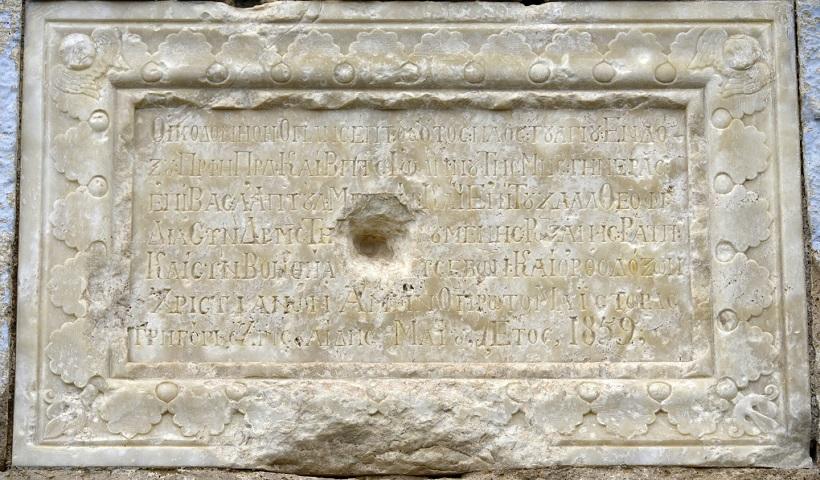 «Ούτος ο θείος ναός του τιμίου ενδόξου προφήτου Προδρόμου και βαπτιστού Ιωάννου ήτο πάλαι ναΐσκος με θόλον, ου τα τείχη ήσαν εζωγραφισμένα παντοιοτρόπως, αλλ’ εκείνος ο ναός κατεδαφίσθη εις τα ερείπια του οποίου ανωκοδομήθη ο νέος ούτος ναός το 1859 έτος επί του αρχιεπισκόπου Χαλδίας κυρίου Θεοφίλου δι’ επιστασίας της καθηγουμενίσσης κυρίας Ρωξάνης μετά της συνοδείας αυτής συν τη βοηθεία των ευσεβών και ορθοδόξων χριστιανών, ων μνησθείη Κύριος ο Θεός εν τη βασιλεία αυτού εις αιώνα τον άπαντα».