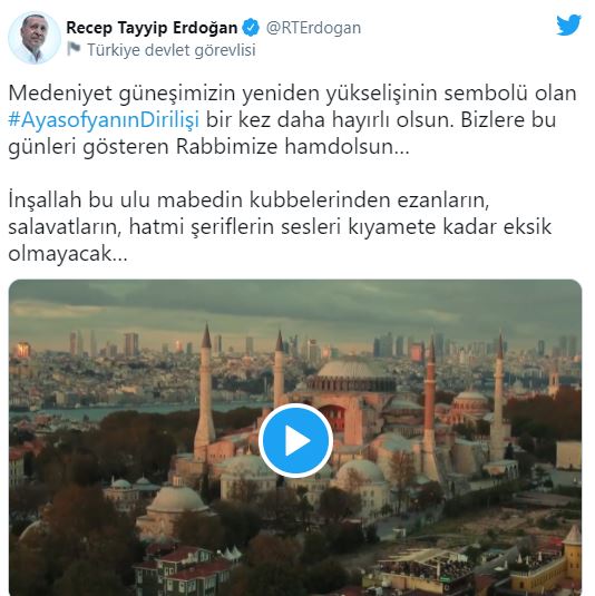 Σε ανάρτηση του στο Twitter, ο πρόεδρος της Τουρκίας χαρακτήρισε την Αγιά Σοφιά: «σύμβολο της αναβίωσης του πολιτισμού μας».