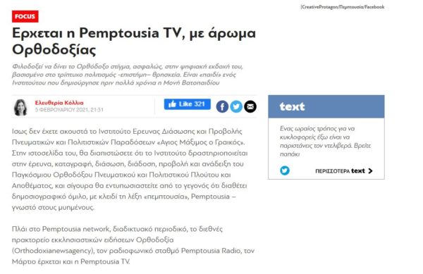 “Ερχεται η Pemptousia ΤV, με άρωμα Ορθοδοξίας” αναφέρει το Protagon.Gr σε επίκαιρη ανάρτησή του σε ρεπορτάζ της δημοσιογράφου Ελευθερίας Κόλλια. “Φιλοδοξεί να δίνει το Ορθόδοξο στίγμα, ασφαλώς, στην ψηφιακή εκδοχή του, βασισμένο στο τρίπτυχο πολιτισμός -επιστήμη– θρησκεία. Είναι «παιδί» ενός Ινστιτούτου που δημιούργησε πριν πολλά χρόνια η Μονή Βατοπαιδίου”.