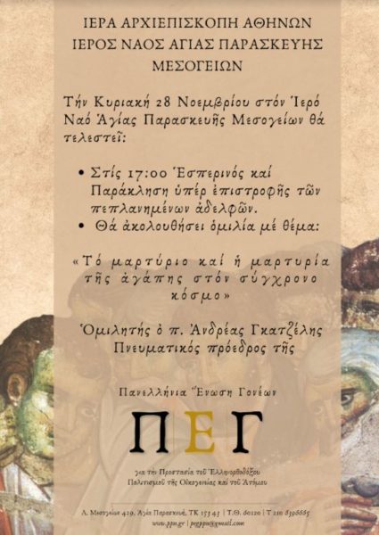 Από την «Πανελλήνια Ένωση Γονέων για την προστασία του Ελληνορθοδόξου Πολιτισμού της Οικογενείας και του Ατόμου», διοργανώνεται μία πνευματική Εσπερίδα.