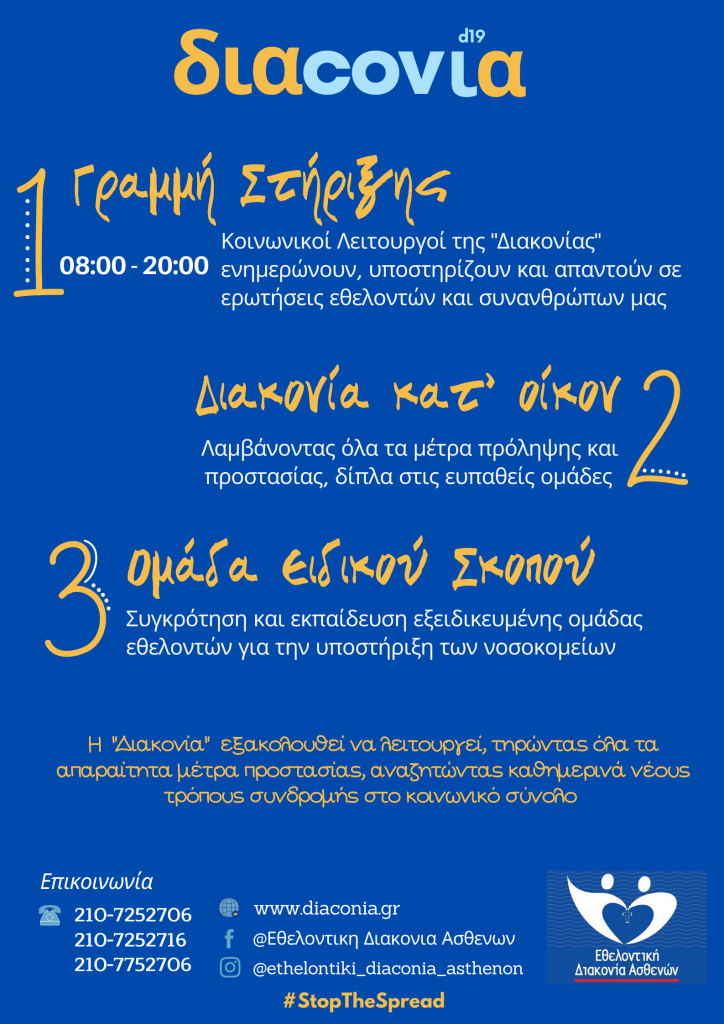 Σε μια εποχή κρίσιμη για όλους, η προσφορά στον συνάνθρωπο αποκτά ακόμα μεγαλύτερη αξία. Η «Εθελοντική Διακονία Ασθενών» το μήνα Απρίλιο και Μάιο, μήνες κορύφωσης της πανδημίας του νέου κορωνοϊού, λειτουργούσε και συνεχίζει να λειτουργεί καθημερινά 8:00 με 20:00, ώστε να μπορεί να είναι δίπλα σε όποιον χρειαστεί. Με τους εκπαιδευμένους εθελοντές ανταποκρίνεται υπεύθυνα και με ασφάλεια στις ανάγκες που η κρίση μεγιστοποιεί.