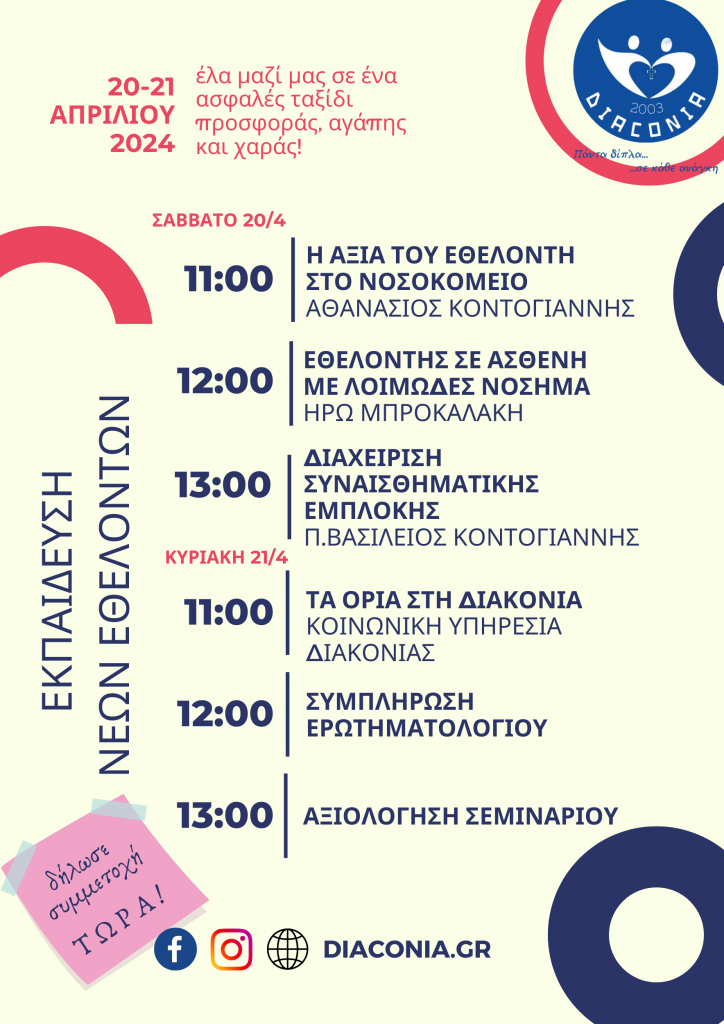 Κάλεσμα συμμετοχής απευθύνει η «Εθελοντική Διακονία Ασθενών» στον πρώτο κύκλο της θεωρητικής εκπαίδευσης νέων εθελοντών που θα πραγματοποιηθεί το Σάββατο 20 και την Κυριακή 21 Απριλίου 2024.