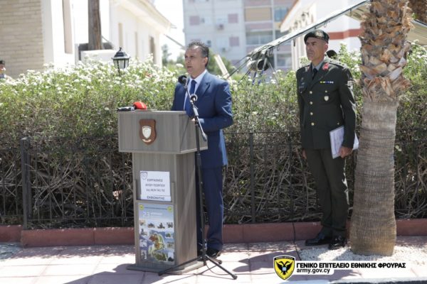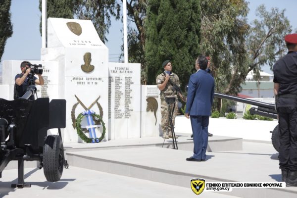 Στον χαιρετισμό του ο Υπουργός Άμυνας ανέφερε πως «έχουμε ιερό καθήκον και υποχρέωση, προς τους ήρωές μας να συνεχίσουμε να αγωνιζόμαστε, με την ίδια επιμονή και αποφασιστικότητα για να καταστήσουμε την πατρίδα μας ελεύθερη».