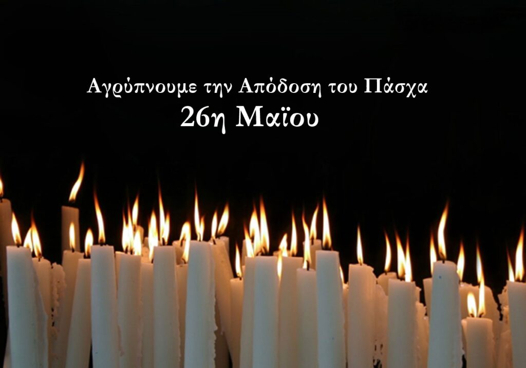 Κατ’ ετούτην την εσπέρα της Τρίτης 26ης Μαϊου, οι ενορίες ολόκληρης της ελληνικής επικράτειας ευρίσκονται σε τέλεση ιερών πανηγυρικών, αναστάσιμων Αγρυπνιών και Εσπερινών Θείων Λειτουργιών για την Απόδοση του Πάσχα, ώστε, ο ευσεβής λαός που στερήθηκε τη χαρά της Αναστάσεως, να νιώσει και φέτος ότι τελικώς δεν στερήθηκε τα νάματα της κορυφαίας Εορτής των Εορτών της Ορθοδοξίας μας.