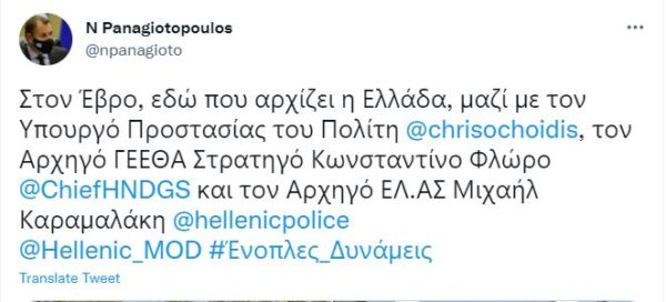 «Ολοκληρώθηκε η κατασκευή του φράχτη μήκους 40 χιλιομέτρων, σε κρίσιμα σημεία των συνόρων μας, παρέμβρια και όχι μόνο, ένα έργο που είναι αξιοθαύμαστο που δημιουργεί δυνατότητες αποτροπής». Επιπλέον, σημείωσε ο Μιχάλης Χρυσοχοΐδης, «ολοκληρώθηκε το αυτοματοποιημένο σύστημα ηλεκτρονικής επιτήρησης των συνόρων μας που επισκεφθήκαμε σήμερα για πρώτη φορά, με τον κ. Παναγιωτόπουλο. Θέλω να σας πω ότι τεχνολογικά είναι εξαιρετικά εξελιγμένο με μεγάλες δυνατότητες και αποτελεσματικότητα στην επιτήρηση των συνόρων».
