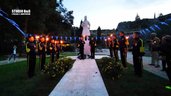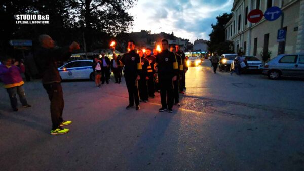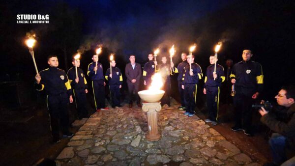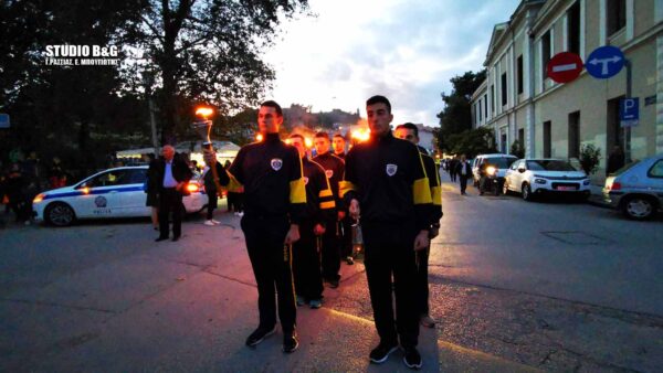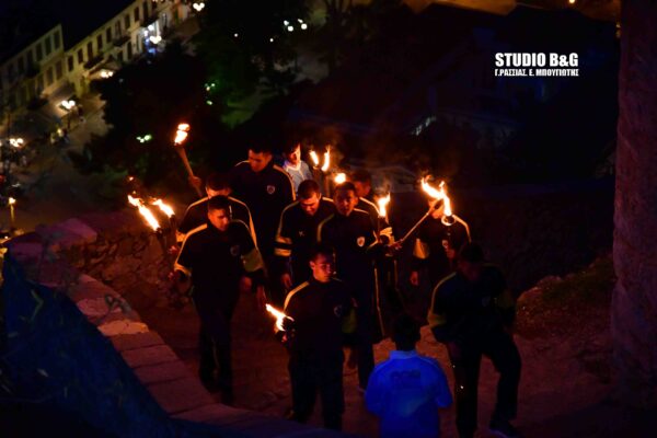 Η πορεία των Ευέλπιδων Λαμπαδηδρόμων ξεκίνησε από τις εγκαταστάσεις του ΦΟΥΓΑΡΟΥ, από εκεί με σημεία διαδρομής και συμβολισμού το Στρατόπεδο και το Λιοντάρι των Βαυαρών, οι Λαμπαδηδρόμοι έφθασαν στο άγαλμα του Σταϊκόπουλου και ξεκίνησαν την άνοδο στο κάστρο του Παλαμηδίου από τα 999 σκαλιά.