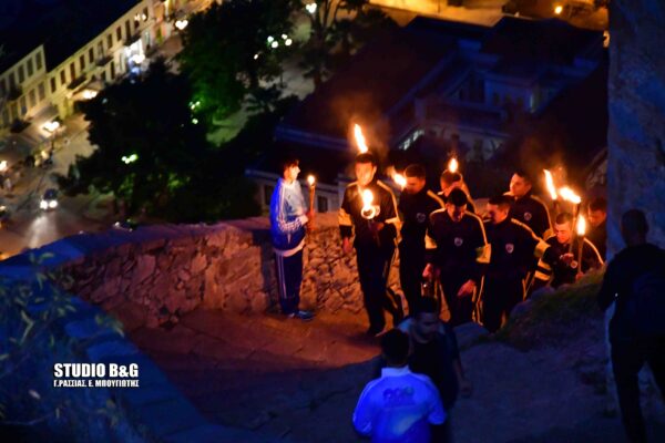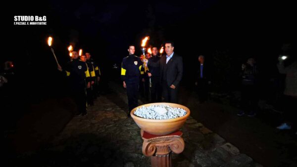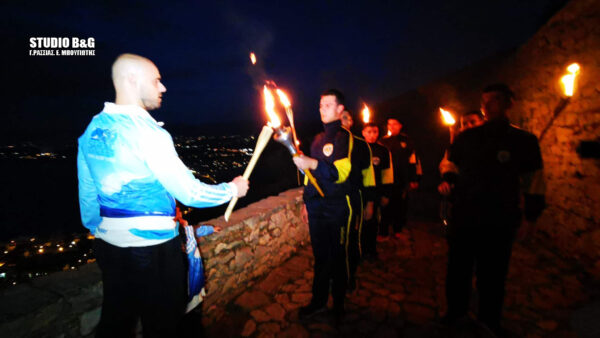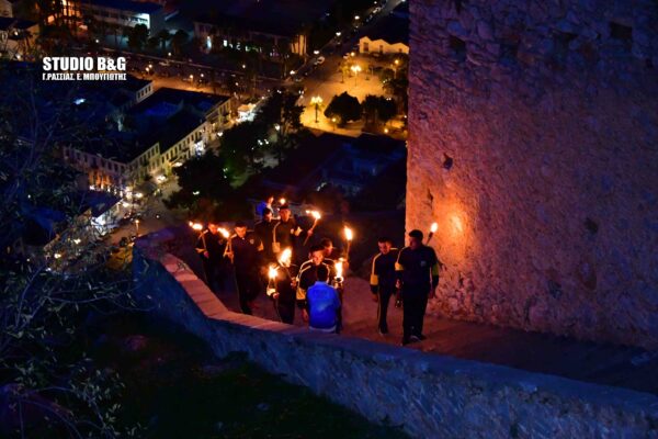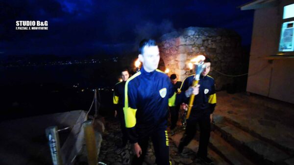 Όταν ο τελευταίος λαμπαδηδρόμος έφθασε στην κορυφή του κάστρου, στις 17: 45, με την άφιξη του τελευταίου λαμπαδηδρόμου τα φώτα του κάστρου σβήνουν και ο δήμαρχος Ναυπλιέων Δημήτρης Κωστούρος άναψε το βωμό που είχε τοποθετηθεί στην είσοδο του κάστρου.