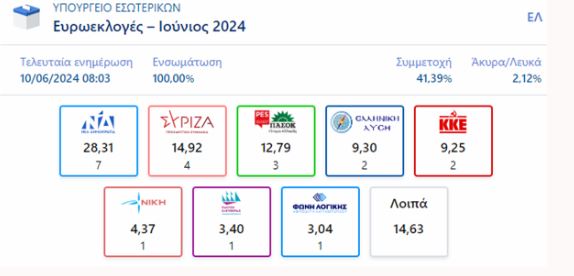 Με ενσωματωμένο το 100% της επικράτειας το κυβερνών κόμμα της χώρας μας λαμβάνει ποσοστό 28,31% και καταλαμβάνει τις 7 από τις 21 έδρες, χάνοντας μία σε σχέση με την προηγούμενη ευρωκοινοβουλευτική περίοδο. Ανησυχία επικρατεί στην Ευρώπη η άνοδος της σκληρής δεξιάς και της εθνικιστικής δεξιάς, στο Ευρωκοινοβούλιο.