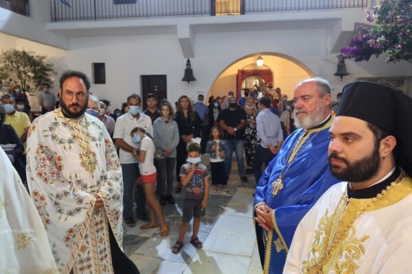 Πλήθος φιλευσεβών Μυκονίων και παρεπιδημούντων παραθεριστών κατέκλυσαν το Καθολικό και τους αύλιους χώρους της πολυαιώνιας Ιεράς και ιστορικής Μονής της Παναγίας Τουρλιανής, στην Άνω Μερά Μυκόνου, τηρούντες τα διατεταγμένα μέτρα υγειονομικής προστασίας, όπου τελέσθηκε ο Μέγας Εσπερινός της Αποδόσεως της Κοιμήσεως της Θεοτόκου, προεξάρχοντος του Σεβασμιωτάτου κ. Δωροθέου Β’, συμπαραστατουμένου από τους Εφημερίους της Μυκόνου και από τη Σύρο, με την παρουσία της Βουλευτού Κυκλάδων κας Αικατ. Μονογυιού, του Θεματικού Αντιπεριφερειάρχη Διαφάνειας κ. Στυλ. Μπρίγκου, της διατελεσάσης Πρωτοδίκου Μυκόνου, του Προέδρου της Τοπικής Κοινότητας Άνω Μεράς κ. Πέτρου Σταυρακόπουλου και της Προέδρου της Αδελφότητος Ανωμεριτών Μυκόνου κας Φραγκίσκας Κουνάνη.