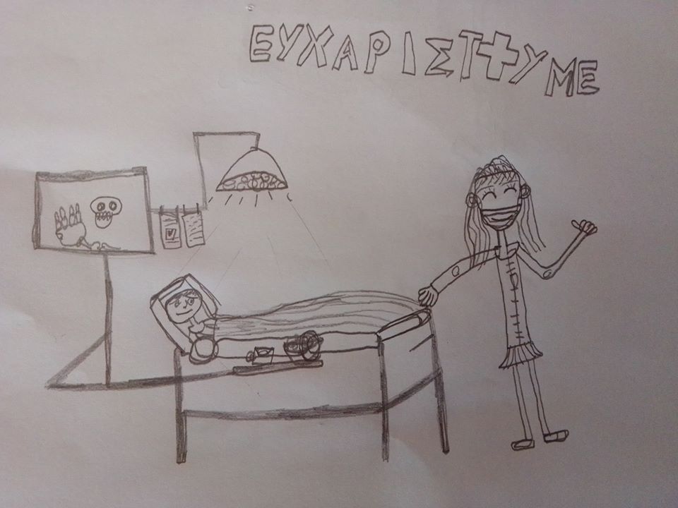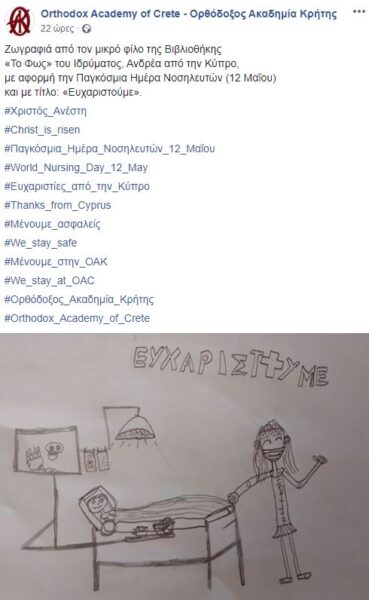 Ζωγραφιά από τον μικρό φίλο της Βιβλιοθήκης «Το Φως» της Ορθοδόξου Ακαδημίας Κρήτης, Ανδρέα από την Κύπρο, με αφορμή την Παγκόσμια Ημέρα Νοσηλευτών (12 Μαΐου) και με τίτλο: «Ευχαριστούμε».