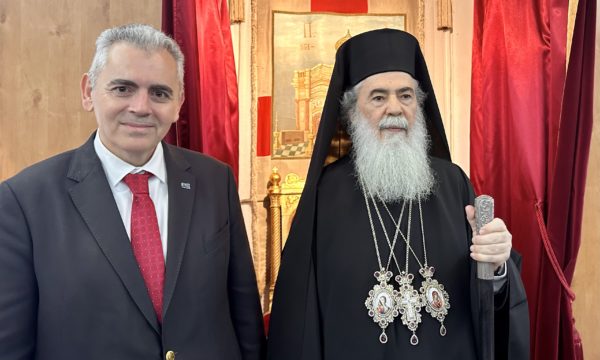 Η αντιπροσωπεία της ΔΣΟ είχε συνάντηση με τον Πατριάρχη Ιεροσολύμων κ. Θεόφιλο, ο οποίος τους ενημέρωσε για τον κομβικό ρόλο του παλαίφατου Πατριαρχείου για το στάτους κβο στα Ιεροσόλυμα και τις σοβαρές προκλήσεις που αντιμετωπίζει η Σιωνίτιδα Εκκλησία από τρομοκρατικές ενέργειες εξτρεμιστών στο Ισραήλ, που επιδιώκουν τον εκτοπισμό των χριστιανών από την Αγία Πόλη.
