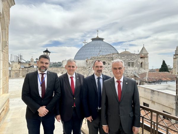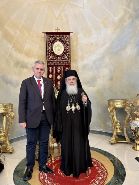 Η αντιπροσωπεία της ΔΣΟ είχε συνάντηση με τον Πατριάρχη Ιεροσολύμων κ. Θεόφιλο, ο οποίος τους ενημέρωσε για τον κομβικό ρόλο του παλαίφατου Πατριαρχείου για το στάτους κβο στα Ιεροσόλυμα και τις σοβαρές προκλήσεις που αντιμετωπίζει η Σιωνίτιδα Εκκλησία από τρομοκρατικές ενέργειες εξτρεμιστών στο Ισραήλ, που επιδιώκουν τον εκτοπισμό των χριστιανών από την Αγία Πόλη.