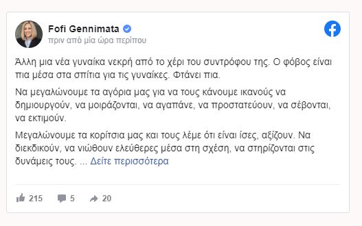 Mε ανάρτηση στα κοινωνικά δίκτυα η πρόεδρος του Κινήματος Αλλαγής, Φώφη Γεννηματά, σχολίασε το θλιβερό περιστατικό της δολοφονίας της νεαρής γυναίκας στη Φολέγανδρο. «Ο φόβος είναι πια μέσα στα σπίτια για τις γυναίκες. Φτάνει πια», τόνισε η κ. Γεννηματά και ταυτόχρονα επεσήμανε: