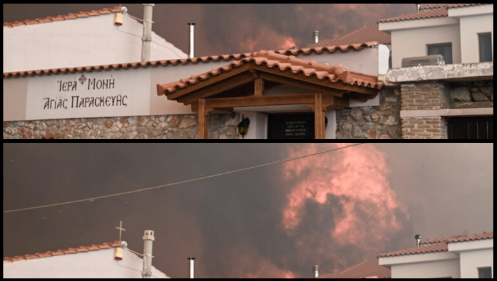 Το μοναστήρι της Αγίας Παρασκευής εκκενώθηκε ενώ καταφέραν να κρατήσουν τη φωτιά μακριά από τα πρώτα σπίτια που βρίσκονται διάσπαρτα, ανάμεσα σε δέντρα, στην περιοχή.
