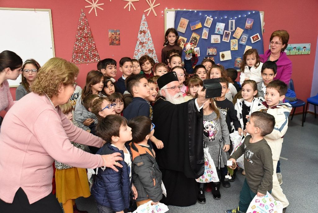 Μετά το πέρας της Θείας Λειτουργίας ο Σεβασμιώτατος επισκέφθηκε το Πνευματικό Κέντρο, όπου συναναστράφηκε με τα παιδιά των κατηχητικών της ενορίας, στα οποία διένειμε χριστουγεννιάτικα δώρα.