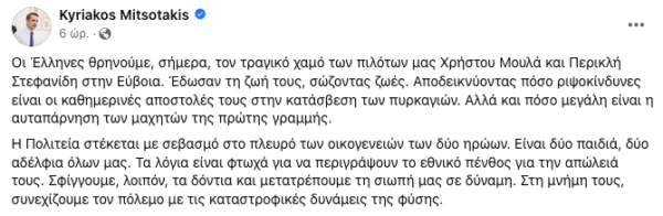 «Οι Έλληνες θρηνούμε, σήμερα, τον τραγικό χαμό των πιλότων μας Χρήστου Μουλά και Περικλή Στεφανίδη στην Εύβοια. Έδωσαν τη ζωή τους, σώζοντας ζωές. Αποδεικνύοντας πόσο ριψοκίνδυνες είναι οι καθημερινές αποστολές τους στην κατάσβεση των πυρκαγιών. Αλλά και πόσο μεγάλη είναι η αυταπάρνηση των μαχητών της πρώτης γραμμής» δήλωσε ο Πρωθυπουργός Κυριάκος Μητσοτάκης από το Εθνικό Συντονιστικό Κέντρο Επιχειρήσεων και Διαχείρισης Κρίσεων για την απώλεια των χειριστών του πυροσβεστικού αεροσκάφους CL-215.