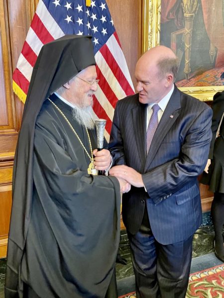 «Ήταν τιμή μου που γνώρισα τον Παναγιώτατο Οικουμενικό Πατριάρχη Βαρθολομαίο και τον άκουσα να μιλά για την επείγουσα ανάγκη αντιμετώπισης της κλιματικής αλλαγής», σημείωσε ο γερουσιαστής Κρις Κουνς από την Πολιτεία του Ντέλαγουερ. Ο Αμερικανός γερουσιαστής είχε την ευκαιρία να συναντηθεί με τον Οικουμενικό Πατριάρχη κατά τη διάρκεια του επίσημου γεύματος που παρέθεσε η πρόεδρος της Βουλής των Αντιπροσώπων, Νάνσι Πελόζι.