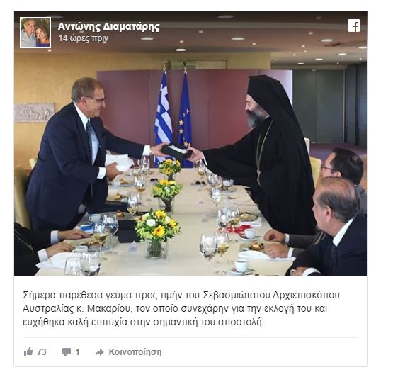 Γεύμα προς τιμήν του Αρχιεπισκόπου Αυστραλίας, κ. Μακαρίου παρέθεσε την Πέμπτη, 12 Σεπτεμβρίου ο υφυπουργός Εξωτερικών, αρμόδιος για τον Απόδημο Ελληνισμό και Εκκλησιαστικά Θέματα κ. Αντώνης Διαματάρης, όπως γράφει στον προσωπικό του λογαριασμό στο Facebook.