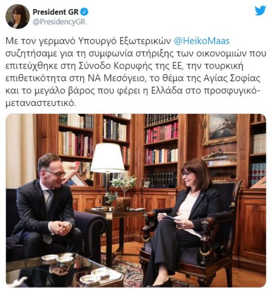 Το θέμα της Αγίας Σοφίας συζήτησε η Πρόεδρος της Δημοκρατίας Κατερίνα Σακελλαροπούλου με τον υπουργό Εξωτερικών της Γερμανίας, Χάικο Μάας, στα πλαίσια της συνάντησης που είχαν νωρίτερα σήμερα στο Προεδρικό Μέγαρο.