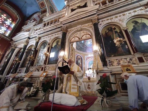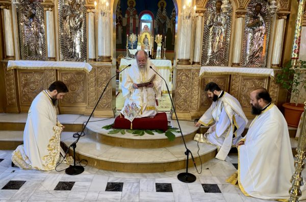 Οι πιστοί συμμετείχαν στην Θεια Λειτουργία και στην ακολουθία της Γονυκλισίας με κατάνυξη , τηρώντας όλα τα προβλεπόμενα μέτρα για την αντιμετώπιση της πανδημίας του κορωνοϊού.