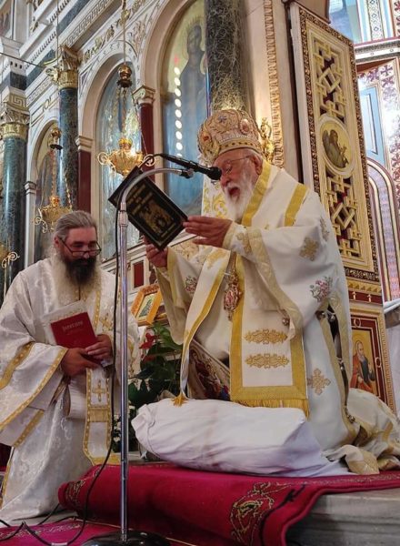 Ο Σεβασμιώτατος κ. Χρυσόστομος χοροστάτησε στην Ακολουθία του Όρθρου, τέλεσε τη Θεία Λειτουργία της Εορτής και τον Εσπερινό της Γονυκλισίας, στον Καθεδρικό Ιερό Ναό του Αγίου Ελευθερίου Ελευθερουπόλεως πλαισιούμενος υπό Ιερέων και Διακόνων της Μητροπόλεως, προεξάρχοντος του Πρωτοσυγκέλλου της Μητροπόλεως Αρχιμανδρίτου π. Χρυσοστόμου Μπένου.