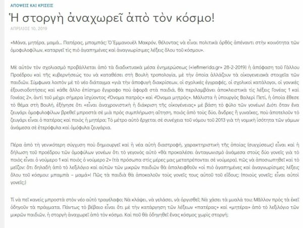 «Μάνα, μητέρα, μαμά… Πατέρας, μπαμπάς: Ὁ Ἐμμανουὲλ Μακρόν, θέλοντας νὰ εἶναι πολιτικὰ ὀρθὸς ἀπέναντι στὴν κοινότητα τῶν ὁμοφυλοφίλων, καταργεῖ τὶς πιὸ ἀγαπημένες καὶ ἀναγνωρίσιμες λέξεις ὅλου τοῦ κόσμου».