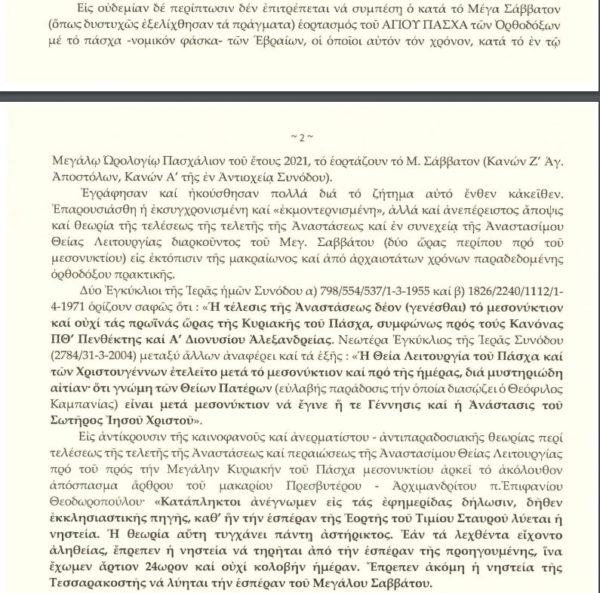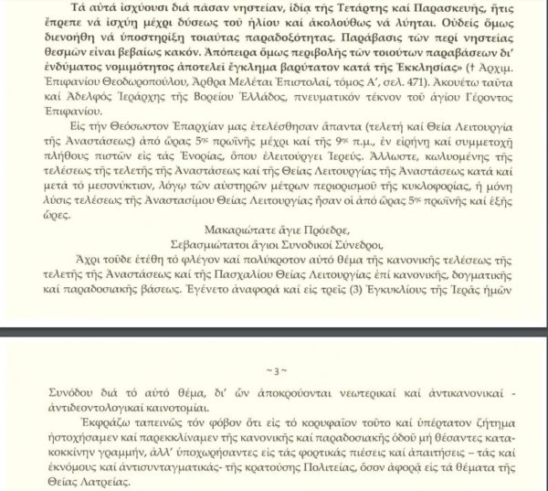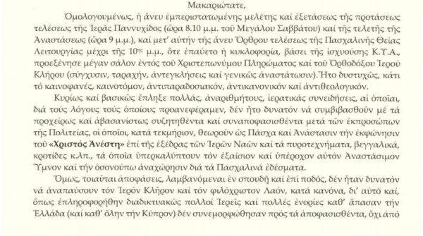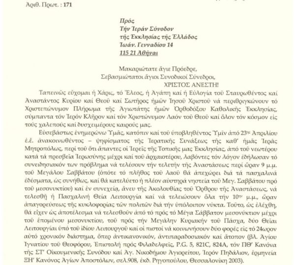 Όπως θα διαβάσετε στα επισυναπτόμενα έγγραφα, ο Σεβασμιώτατος Μητροπολίτης Κυθήρων, λίγες μόλις ημέρες προτού συνεδριάσει η Διαρκής Ιερά Σύνοδος, απέστειλε επιστολή προς τον Μακαριώτατο Αρχιεπίσκοπο Αθηνών και Πάσης Ελλάδος και Πρόεδρο κ.κ. Ιερώνυμο και τους Συνοδικούς Συνέδρους. Σε αυτήν έκανε λόγο για το ψήφισμα των πατέρων της Ιεράς Μητροπόλεως Κυθήρων και Αντικυθήρων, στο οποίο εξέφραζαν συνειδησιακό πρόβλημα σε σχέση με την ώρα εορτασμού της Αναστάσεως (με ό,τι αυτό συνεπάγετο), αλλά και το ότι αυτή τελικά «συνέπιπτε με το νομικόν φάσκα των Εβραίων», κρίνοντας ότι η Ιεραρχία αστόχησε στις αποφάσεις της. Στην επιστολή κρίνει δε ότι αγνοήθησαν αποφάσεις παλαιότερων Συνόδων, παρενέβησαν άγιοι και ιεροί κανόνες, γεγονός που εν τέλει «έπληξε αναρίθμητες, ιερατικές συνειδήσεις».  Ο Σεβασμιώτατος τονίζει ότι η επιστολή γράφτηκε από θλίψη, ιδίως για τις τιμωρίες των κληρικών, και όχι από ασέβεια ή απείθεια και καταλήγει παρακαλώντας να ανακληθούν οι «διωγμοί» των κληρικών, που τέλεσαν άλλη ώρα την Ακολουθία της Παννυχίδος.