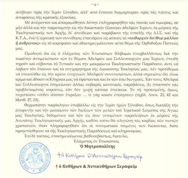 Μετά λύπης ο Μακαριώτατος Πρόεδρος της Διαρκούς Ιεράς Συνόδου διεπίστωσε, και συναπεδέχθησαν οι Σεβασμιώτατοι Συνοδικοί Αρχιερείς, ότι ιδίως ο Σεβασμιώτατος Μητροπολίτης Κυθήρων κ. Σεραφείμ, και μέσω νεωτέρου κειμένου του προς την Διαρκή Ιερά Σύνοδο, καταφέρεται εναντίον των Αποφάσεων Αυτής, επιμένει να μην αντιλαμβάνεται την κρισιμότητα των δυσκόλων και εκτάκτων αποφάσεων της Διαρκούς Ιεράς Συνόδου για την δημόσια υγεία και την προστασία της ανθρώπινης ζωής, αυτοαπομονώνεται και θέτει εαυτόν μακράν της συλλογικής προσπάθειας της Εκκλησίας της Ελλάδος, η οποία στο σύνολό Της πασχίζει και εργάζεται τόσο για την την ακώλυτη επιτέλεση της Θείας Λατρείας, όσο και για την τήρηση των υγειονομικών μέτρων.