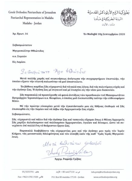 Ο νέος Έξαρχος του Παναγίου Τάφου στην Ελλάδα Πανοσιολ. Αρχιμ. Ραφαήλ Γρίβας απέστειλε ευχαριστήριο απάντηση στον Σεβασμιώτατο Μητροπολίτης Φθιώτιδος κ. Συμεών όπου αναφέρει μεταξύ άλλων “Εκ βάθους καρδίας Σας ευχαριστώ δια τα καλά σας λόγια, δια τας πολυτίμους ευχάς και την αγάπη Σας. Η αγάπη Σας με συγκινεί και με ενισχύει εις την νέαν μου διακονίαν”.