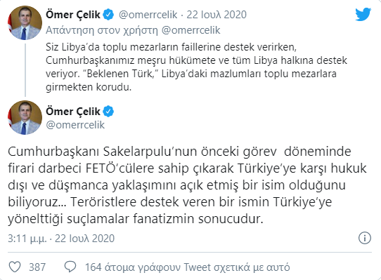 «Μετά την απόφαση του προέδρου μας για την μετατροπή της Αγίας Σοφίας σε τζαμί, η Ελλάδα χρησιμοποιεί μαύρη προπαγάνδα με κάθε τρόπο. Οι δηλώσεις της προέδρου της Ελλάδας Σακελλαροπούλου που στοχεύουν την Τουρκία δείχνουν την άγνοια της στην γνώση της ιστορίας και της νομικής. Η πρόεδρος της χώρας που είναι η πρωτεύουσα της είναι η μοναδική στην Ευρώπη που δεν έχει τζαμί, μιλάει για θρησκευτική αμοιβαία κατανόηση με αφορμή την Αγία Σοφία. Αυτό είναι ξεκάθαρο παράδειγμα διπλού στάνταρτ. Η Ελλάδα είναι η χώρα που δεν ικανοποιεί τα βασικά κριτήρια του θρησκευτικού σεβασμού» γράφει και καταλήγει «με τόσες γνωστές σφαγές και βαρβαρότητες των Ελληνοκυπρίων η πρόεδρος της Ελλάδας Σακελλαροπούλου στην επέτειο της Επιχείρησης Ειρήνης να μιλάει για Τουρκική Βαρβαρότητα .Αυτό το καταδικάζουμε ξεκάθαρα. Αυτό που εσείς αποκαλείτε Τουρκική βαρβαρότητα, είναι μια νόμιμη αποστολή λύτρωσης και ελπίδας των κατατρεγμένων όλου του κόσμου. Η Τουρκία δεν θα επιτρέψει να αγνοήσετε τους Τουρκοκυπρίους όπως αγνοείτε τις σφαγές στην ιστορία».