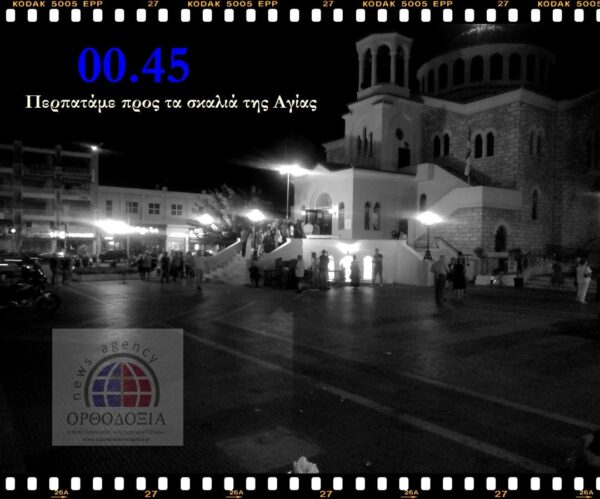 ΕΝΑ ΛΕΠΤΟ, αργότερα, 00.46 – Είμαστε επί της κεντρικής εισόδου. Μέσα, έχει ήδη εκκινήσει, απο ώρα, η Ιερά πανηγυρική Αγρυπνία προς τιμήν της πολιούχου Οσιοπαρθενομάρτυρος Αγίας Παρασκευής: